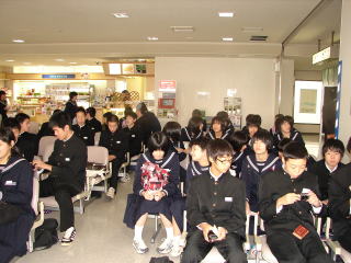 | (9:00) これから学級別に出発です。バスの中です。 前方は先生方。 ちょっとお疲れ気味(?)の先生方に対し、後方にはとっても元気な生徒たち。日に日に元気になっていくようです。 「ワオー」と盛んに手を振っています。 バスガイドさんのお話にもよく反応しているそうです。 (さすが、人の話をよく聞く生徒たちです) |