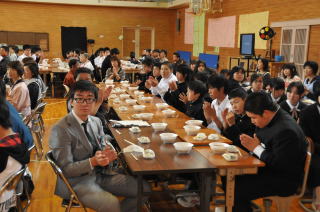 | 開会行事、パフォーマンス大会が終了した体育館。 学校中が、一転して「収穫感謝祭」に様変わり。男子生徒は、テーブルや椅子を並べ、女子生徒は、おにぎりつくりです。 色とりどりのエプロンに身を包んだ女子生徒は、まるでお花畑に来たようです。わかめごはんをおにぎりにしていきます。 その後、体育館ステージでは「餅つき」が行われました。お父さん、お母さんのお手伝いをいただきながら、「よいしょー」「よいしょー」のかけ声に合わせて、杵が振り落とされます。 その後、みんなでおいしい肉汁に、つきたてのお餅を入れていただきました。 |
