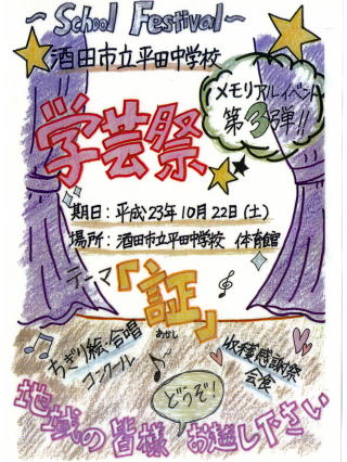 | 学校中に歌声があふれています。 ステージ上の看板も完成し、いよいよ学芸祭当日を待つばかり。 みんなの思い出に残る1日になりますように。 |