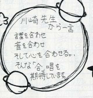 | 2年A組 スローガン「一音入魂 2Aの心を声に 輝くために」 はじめは、自分のオンチがばれるのが嫌で、小さい声で歌っていました。でも、実行委員の人たちがいい合唱にしようと頑張っているのを見て、今のkままではいけないと気づくことができました。それからは、練習でも、音をはずすとかはずさないとかいうことよりも、一生懸命歌うことを心がけました。 |