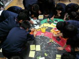 | 今年度のちぎり絵テーマは「証」。 さて、どんな思いを込めた絵が完成するでしょうか。 (左)学芸祭初めての1年生。ちぎり絵にも初挑戦。先生も一緒に頑張っています。 (中)2年生のちぎり絵はスタートが早く、手際がよいので他学年より一歩進んでいる感じです。一人ひとりが、それぞれの役割分担をしっかり果たしているところがいいですね。 (右)3年生は、原画が細かい。さすがです。慣れた手つきで作業を進めています。完成がとても楽しみです。 |