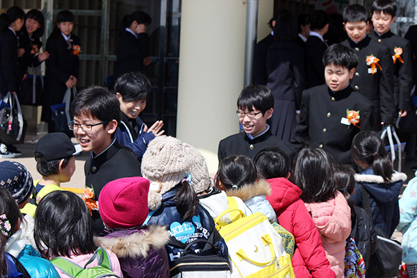 在校生のつくる花道を、卒業生が一人ずつ進みます。
