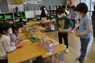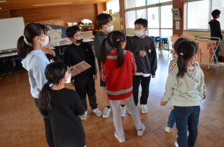 | ●12月19日(月) 今年度、田植えと稲刈りで5年生の子ども達がたいへんお世話になったJAの木村さんをお招きし、学年で収穫感謝祭を行いました。これまで総合的な学習の時間に調べたお米に関するクイズを出したり自分達で考えたお米の名前やキャラクターを披露したりして楽しい時間を過ごしました。タブレットPCを使って、米の消費拡大や農業の課題に関する自分達の考えもプレゼンしました。 |