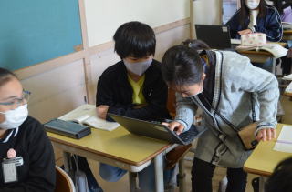 | 11月4日(木) 今日は、秋晴れのもと、3年1組の子ども達が、グラウンドで理科の実験に取り組んでいました。「太陽の光を調べよう」という単元の学習で、虫めがねで日光を集めて黒い紙に当てると穴があき、思わず歓声があがっていました。 5年生の教室では、タブレットを使って国語の学習に取り組んでいました。 |