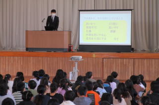 | 12月22日(水) 今日は、体育館で表彰朝会がありました。その中で、酒田海上保安部の皆様においでいただき、「第22回未来に残そう青い海・海上保安庁図画コンクール」で酒田海上保安部長賞に輝いた本校1年児童に賞状を渡していただきました。他にも、読書感想文・読書感想画コンクールの表彰伝達、バレーと卓球のスポーツ少年団の活躍の紹介がありました。 |