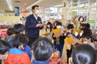 | 12月13日(月) 3年1組の子ども達が、今日、学区内のスーパーマーケットで、自分たちで収穫したお米とサツマイモを売る『キラキラ販売会』を行いました。時折、雪混じりの強風が吹くあいにくの天気でしたが、たくさんの皆様にお越しいただき、あっという間に完売しました。子ども達が作ったプレゼントやレシピもたいへん喜んで受け取っていただき、子ども達もとてもうれしそうでした。 |