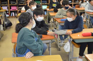 | 12月3日(金) 学区にお住いの酒田特別支援学校に通っている1年生の男の子が、昨日と今日の2日間、交流のために本校の1年生といっしょに学校生活を送りました。子ども達が考えた宮野浦小学校にかかわるクイズで楽しんだり、昔の遊びであるけん玉に挑戦したりして、楽しい2日間を過ごしました。 |