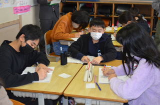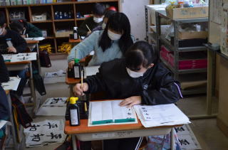 | 12月23日(木) 年末年始休業明けの1月12日に予定されている書き初めに向けて、どの学年学級も、その練習に力が入っています。今日は、4年2組の子ども達が、書き初めの題材である「平和」という文字と自分の名前を一生懸命に練習していました。また、4年1組では外国語活動があり、ALTの先生といっしょにクリスマスのゲームに楽しく取り組んでいました。 |