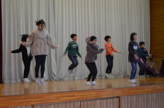 | 12月15日(水) 今朝の全校集会は、児童会の保健体育委員会による短縄跳びのいろいろな技の紹介でした。前まわしや後ろまわしをはじめ、サイドクロス等の跳び方の紹介があり、下学年の子ども達はあこがれの眼差しで見つめていました。今後、冬期間の体力づくりとして、体育等の時間や休み時間等に取り組む予定です。 |