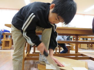 | 2月13日 のこぎりで木を切ってみよう 4年生が図工室で全員挑戦していました。 のこぎりを引くことは日常ではありませんが、 細かく切る男子も何人かいました。 |