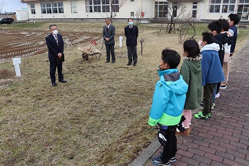 令和2年11月20日に予定していましたが、悪天候のためランチルームで式典のみ行い、業者に作業していただきました。そして、3月8日、同窓会長、新堀コミ振会長、校長、代表児童で土入れを行いました。