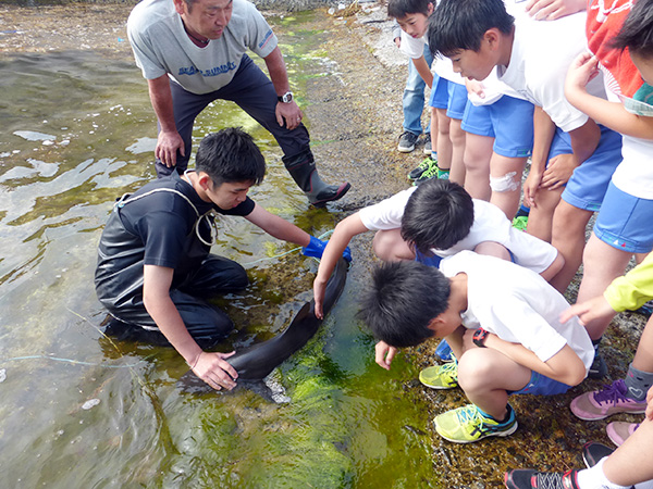 【飛島いきいき体験】 「飛島いきいき体験スクール」で来校した 浜田小と宮野浦小の児童の皆さんに生きているサメを触らせる 「サメとのふれあい体験」で新君が「先生役」を務めてくれました。